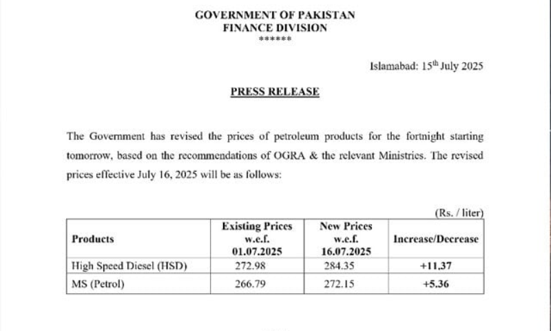 Islamabad, July 16, 2025: In another heavy blow to inflation-weary citizens, the federal government has delivered a fresh fuel price shock, jacking up the rates of petrol and diesel amid rising global crude oil prices.