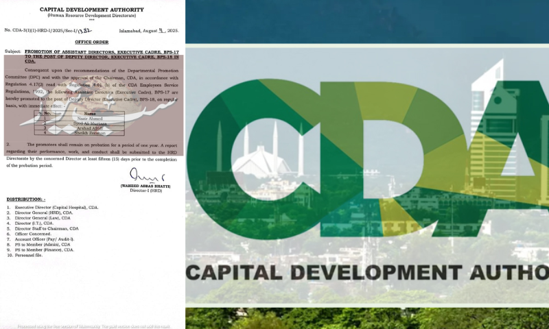Islamabad, August 11, 2025: The Capital Development Authority (CDA) has promoted four Grade-17 Assistant Directors to Grade-18 Deputy Directors, reportedly bypassing several senior officers.