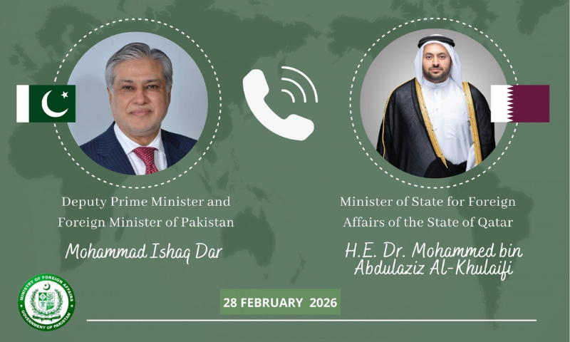 Islamabad, February 28, 2026: Deputy Prime Minister and Foreign Minister Senator Mohammad Ishaq Dar held a telephone conversation with Qatar’s Minister of State for Foreign Affairs, Dr. Mohammed bin Abdulaziz Al-Khulaifi, today.