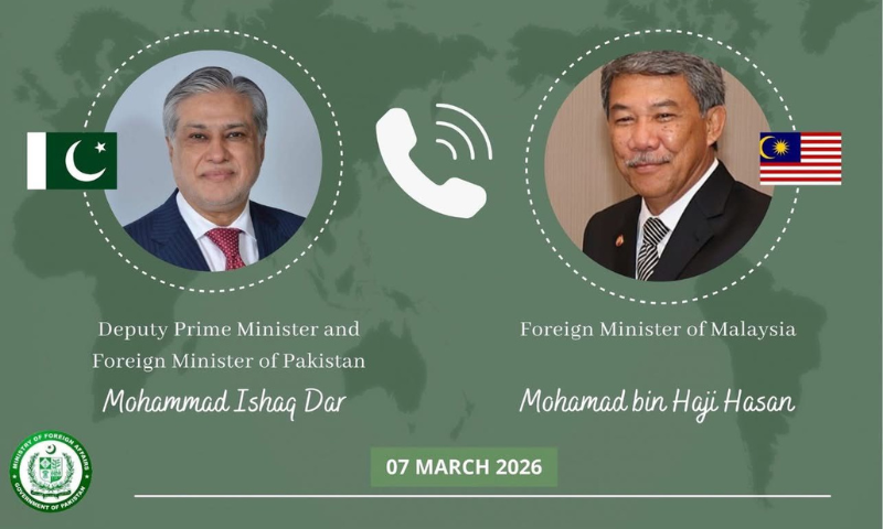 Islamabad, March 7, 2026: Pakistan’s Deputy Prime Minister and Foreign Minister Mohammad Ishaq Dar held a telephone conversation with Mohamad Hasan, the Foreign Minister of Malaysia, to discuss the evolving regional situation.