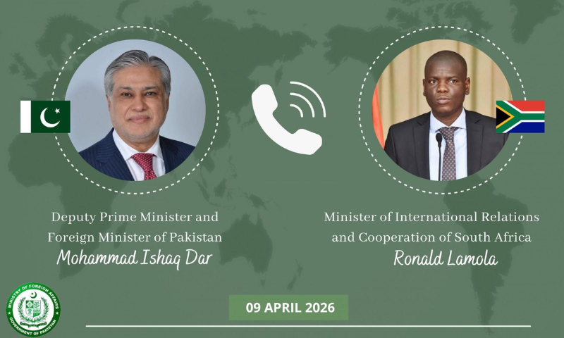 Islamabad, April 9, 2026: Pakistan’s Deputy Prime Minister and Foreign Minister, Mohammad Ishaq Dar, held a telephone conversation with Ronald Lamola, Minister of International Relations and Cooperation of South Africa, to discuss the latest developments in the Middle East and the broader region.